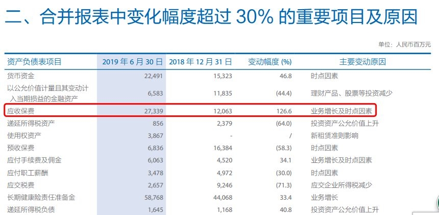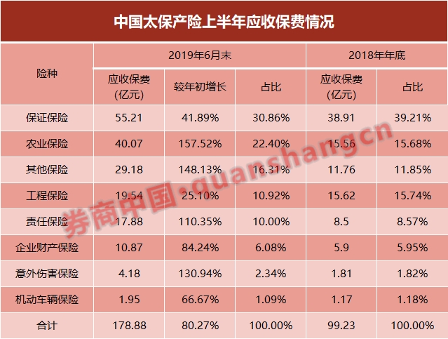 中国太保2019年半年报披露了各险种的应收保费情况。其中,应收保费金额和增幅较大的是保证保险、农业保险,这两个险种的应收保费压力明显高于其他业务。
