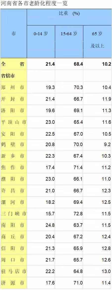 河南也不例外。数据显示,2017年,除鹤壁市之外,河南其余17个城市,年龄在65岁之上的常住人口,已经全面突破10%大关。其中,许昌、漯河、商丘、信阳、周口和驻马店市,65岁以上常住人口超过12%,驻马店市达到13%。