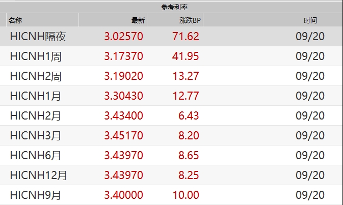 上图为,国内上海银行间拆借利率报价。对比来看,9月20日,香港人民币Hibor隔夜利率报3.025%,较当日国内隔夜Shibor高出27.9个基点。