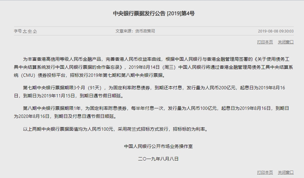 统计显示,包括此次发行,2019年以来,央行已经先后5次在中国香港共计发布了9期央票。值得一提的是,央行在《2019年第二季度中国货币政策执行报告》中,首次提出在港建立发行中央银行票据的常态机制,完善香港人民币债券收益率曲线。