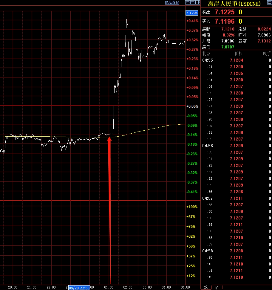事实也证明,央行预判非常靠前。在北京时间9月21日1点开始,离岸人民币出现大幅贬值,从7.0892在一个小时间内下跌到7.1291,贬值近400点。当时美国东部时间在下午交易时段,而国内已经闭市。