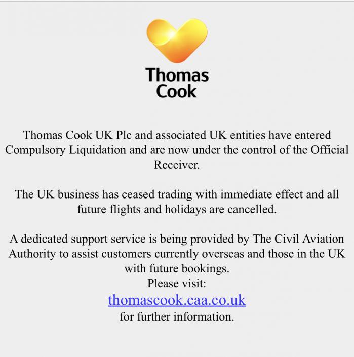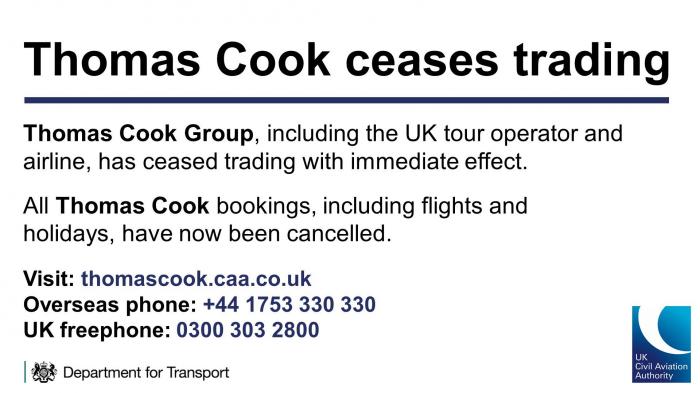 上述消息过后,英国交通部发布声明称托马斯·库克所有的旅游产品和航班立即停止销售,该公司所有航班亦已全部取消。托马斯·库克的停摆立即影响了大量的英国甚至国际旅客,不少旅客因此滞留机场。