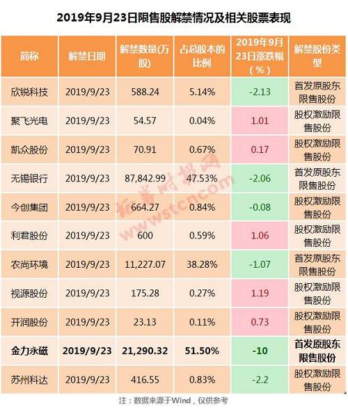值得注意的是,除了金力永磁外,今天也有不少限售解禁股。其中,存在首发原股东限售股份解禁的多数公司股价下跌,但跌幅远不如金力永磁大,如欣锐科技仅下跌2.13%,无锡银行、农尚环境跌幅分别仅下跌2.06%和1.07%,和今天大盘整体表现相差不大。部分存在股权激励限售股份解禁的公司股价甚至逆势上涨。