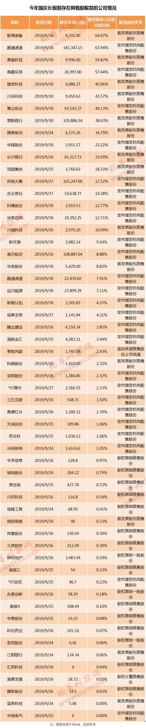 值得注意的是,9月30是国庆长假前解禁最集中的日期,当天共有22家公司限售股解禁。