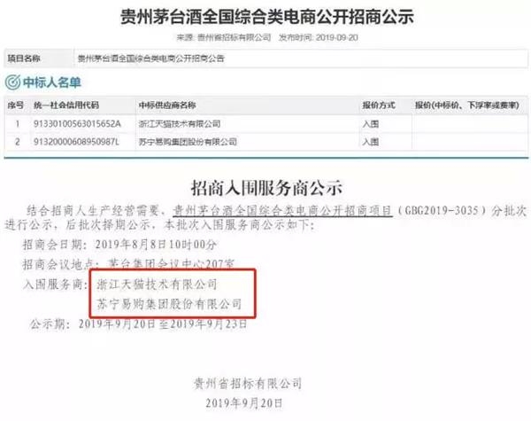 9月20日,茅台酒首批全国综合类电商招商结果出炉,浙江天猫技术有限公司和苏宁易购集团股份有限公司两家入围。