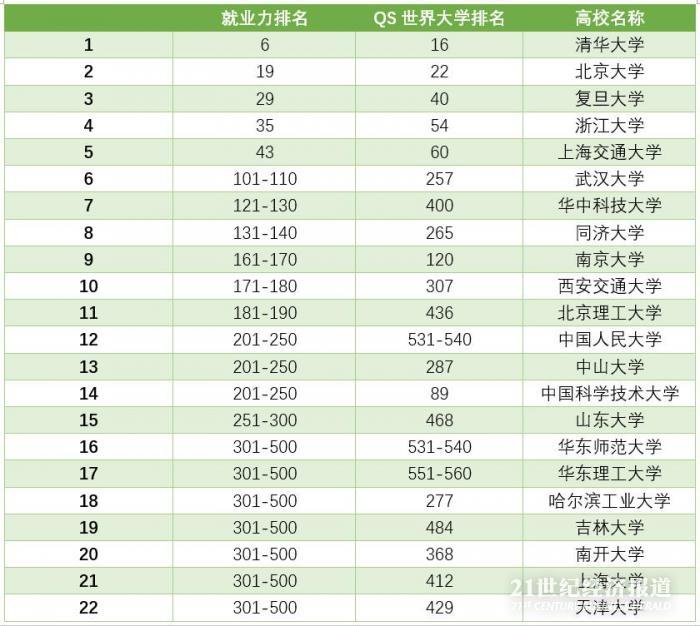 进入QS2020世界大学毕业生就业力排名榜单的22所高校