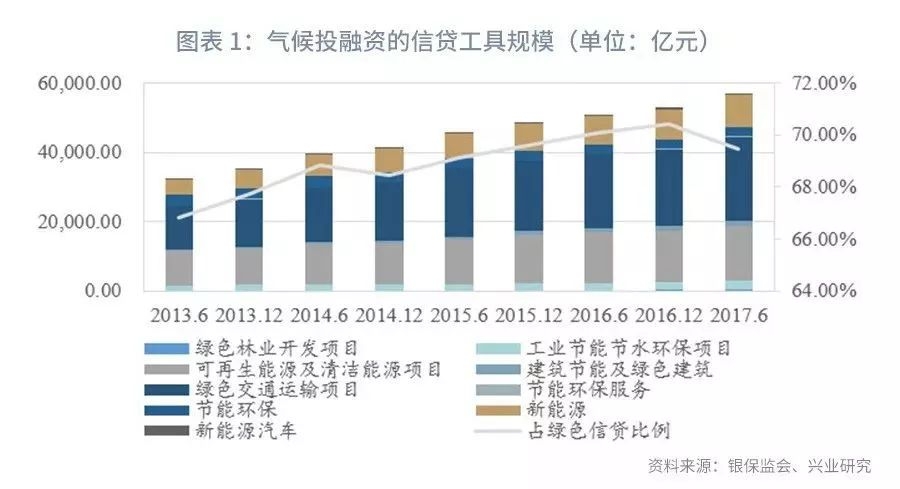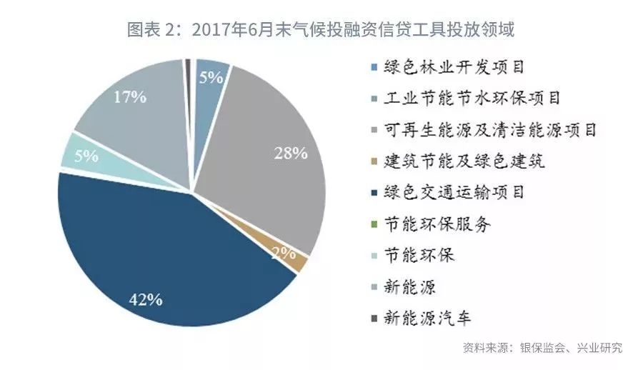 从投放领域来看,根据2017年6月的21家主要银行的绿色信贷统计表,气候投融资的信贷余额主要投向“绿色交通运输项目”(占比42%),“可再生能源及清洁能源项目”(占比28%)、“新能源”(新能源制造端贷款)(占比近17%)、“工业节能节水环保项目”(占比近5%)。