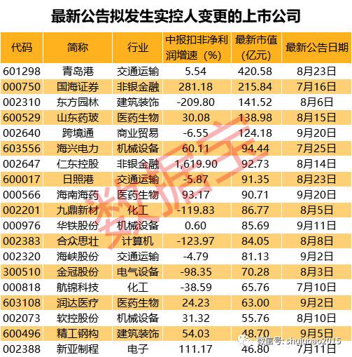 除实控人已发生变更的上市公司外,另有36家上市公司下半年来发布了实控人拟变更或可能变更的公告,其中包括ST中天、*ST人乐、ST中新三只风险提示股。青岛港、国海证券、东方园林、山东药玻和跨境通的最新市值超过100亿元。业绩方面,国海证券、众合科技和裕兴股份中报营业收入和扣非净利润增速均超过30%,成长性较好。