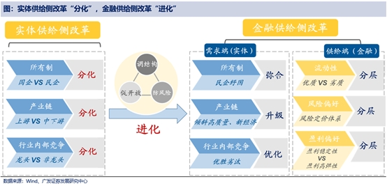 金融供给侧改革推动A股迈入进化论2.0时代,总结四个字就是“分化、分层”。金融供给侧改革四大要义“调结构、降成本、促开放、防风险”作用于实体端和金融端——从金融的需求端来看,“民企纾困”将使所有制“分化”走向“弥合”,金融供给侧改革将改善民企的融资环境降低融资成本;产业链从“分化”到“升级”,金融供给侧改革将再平衡上中下游的利润结构,促进金融资源向高质量、新经济领域倾斜;行业内部竞争从“分化”到“优化”。“促开放、防风险”基调下会进一步鼓励优胜劣汰、使行业内部竞争“优化”;从金融的供给端来看,金融供给侧改革引导“市场在资源配置中发挥更大的作用”,这会带来流动性分层,风险定价体系的分层,投资者对盈利的偏好分层,推动投资思维向存量思维与α思维转变,A股进一步迎来进化。