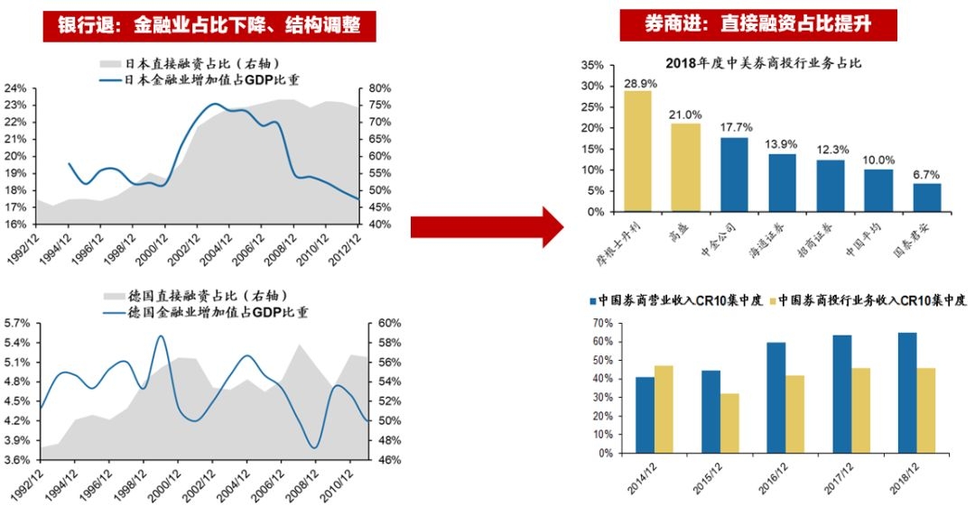 (1)调结构给金融机构带来的影响是 “券商进、银行退”。德日等海外经验表明,对于银行主导型的经济体,金融改革过程中往往伴随金融业增加值占比的下降。金融供给侧改革引导直接融资占比提升,银行资产扩张告别高增速,降低融资成本意味着银行息差受影响;而此消彼长,带来的是券商重要性得到提升,券商投行业务收入有望提高。