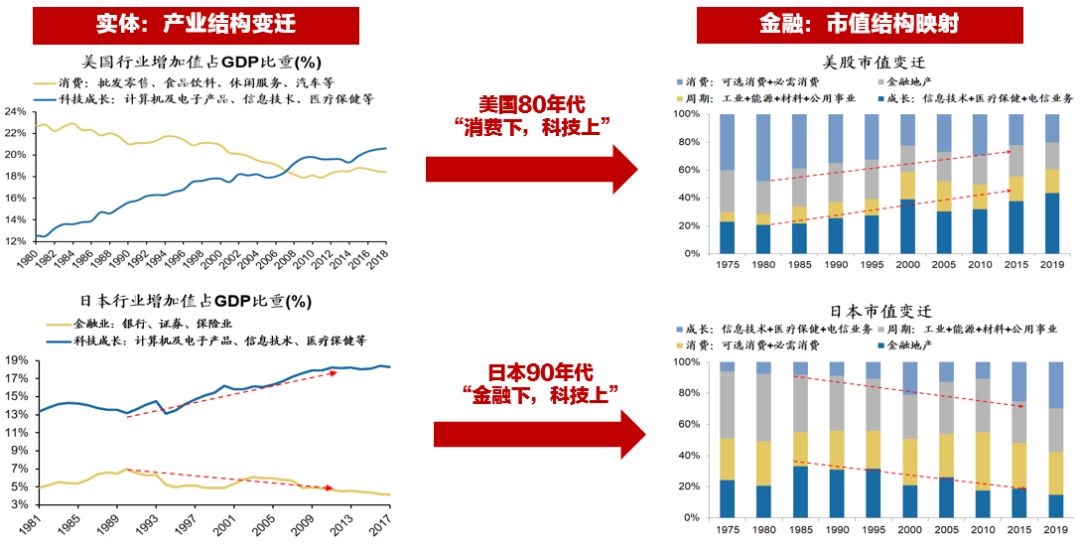 (2)借鉴美日经验,随着经济产业格局的升级与变迁,金融市场相应压缩低效率领域供给、增加高效率领域供给,这一过程使得经济产业格局的变迁将在直接融资市场得到更积极的映射,体现在核心产业的股市市值、收入与利润占比上升。中国的经济驱动力已经变迁,而产业变迁下新经济领域(消费、成长)的市值占比依然较低,具备长期的发展空间。