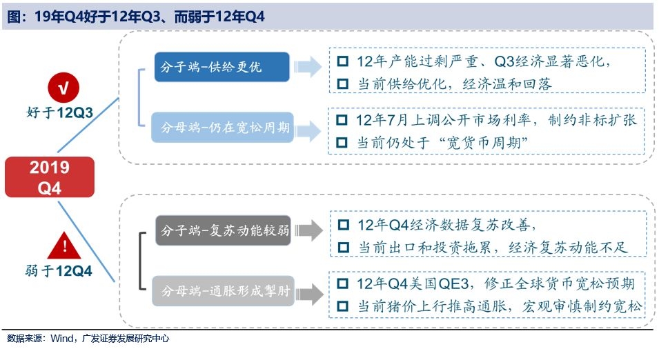 19年Q4是“未见起色的经济+幅度有限的宽松”,好于12Q3、弱于12Q4。19年Q4,企业供给格局较12年更优、经济没有12年Q3那么差,但也很难见到12年Q4那样明确的改善;其次,依然处于“宽货币+稳信用”周期,但通胀抬头对持续宽松形成一定掣肘,货币政策更多靠疏通传导而非大水漫灌。因此,19年Q4相较于12年Q3“未见起色的经济复苏+迟迟等不到的宽松政策”略好,但较12年Q4“经济数据改善”略差,市场整体可能呈现震荡格局。