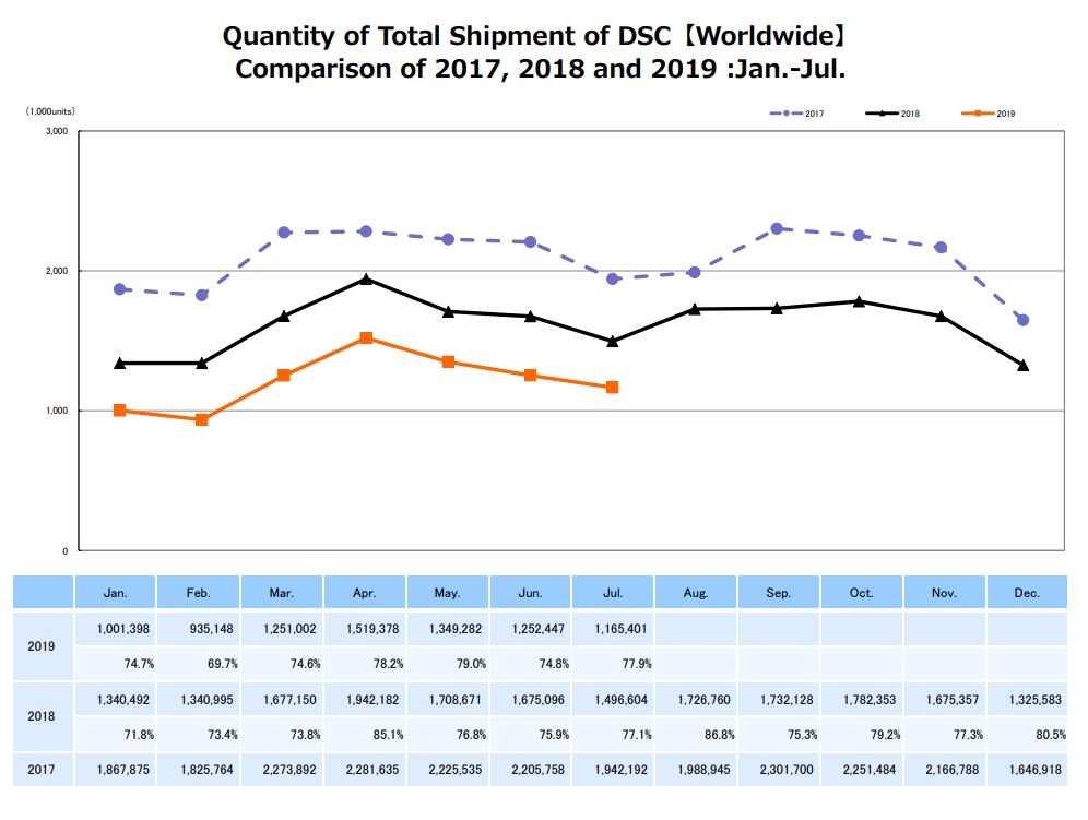 CIPA最新数据显示,今年前7个月,数码相机出货量仅为847万台,仅为去年全年的42%。CIPA曾对2019年的相机出货量进行预测。他们认为,2019年数码相机的总出货量预计为1690万台,同比下降12.9%。如今来看,前7个月仅完成预测任务的50%。