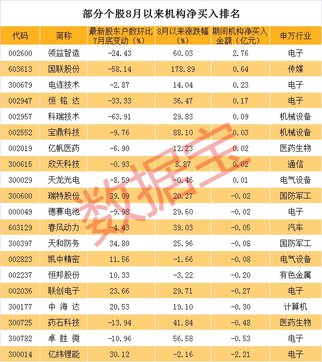数据宝统计显示,榜单中有20只股票8月以来出现机构买卖的情况。其中,领益智造成为机构最青睐的股票,8月以来龙虎榜合计净买入2.76亿元;位居第二位的是国联股份,8月以来龙虎榜净买入0.65亿元。此外,电连技术、恒铭达、科瑞技术等个股8月以来龙虎榜均出现机构净买入。