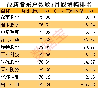 78家公司最新股东户数相比7月底增长,其中31家股东户数环比增幅超10%。包括深南股份、君禾股份、中新赛克等。其中,深南股份增幅最大,从7月底的26623户增加到最新的47389户,大幅增加78%。紧随其后的为君禾股份,其最新股东户数为13466户,比7月底增加76.51%。
