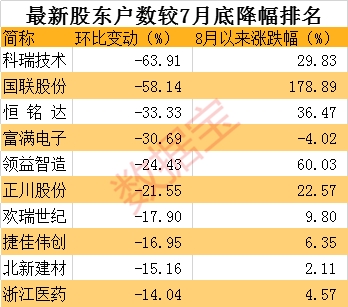 126家股东户数下降公司中,有18股东户数下降超10%,包括科瑞技术、国联股份、恒铭达等。科瑞技术股东户数下降最为明显,其最新股东户数为2.88万户,较7月底下降幅度接近64%,7月底该股股东户数接近8万户。国联股份下降幅度位居次席,其最新股东户数为13233户,下降超过58%,7月底该股股东户数超过3万户。