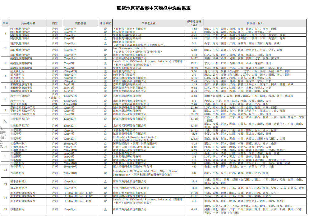 本次联盟采购共有77家企业。产生拟中选企业45家,拟中选产品60个。与联盟地区2018年最低采购价相比,拟中选价平均降幅59%;与“4+7”试点中选价格水平相比,平均降幅25%。