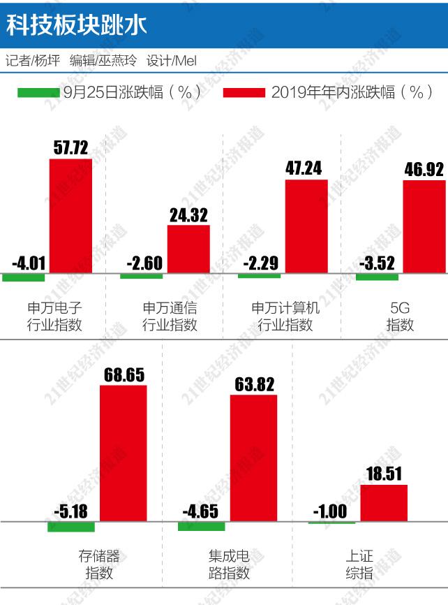 9月25日,绵延许久的科技股行情,突然集体回调。当日,申万电子、通信、计算机三大行业领跌A股市场,相关指数分别下降4.01%、2.60%和2.29%,大盘资金净流出560.22亿元。