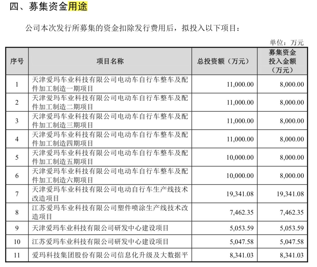 募集资金部分用途(图片来源:爱玛科技招股书)