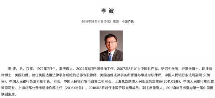 李波曾长期在央行系统工作,曾任央行货币政策司司长,2018年8月,当选为第十届中国侨联副主席。