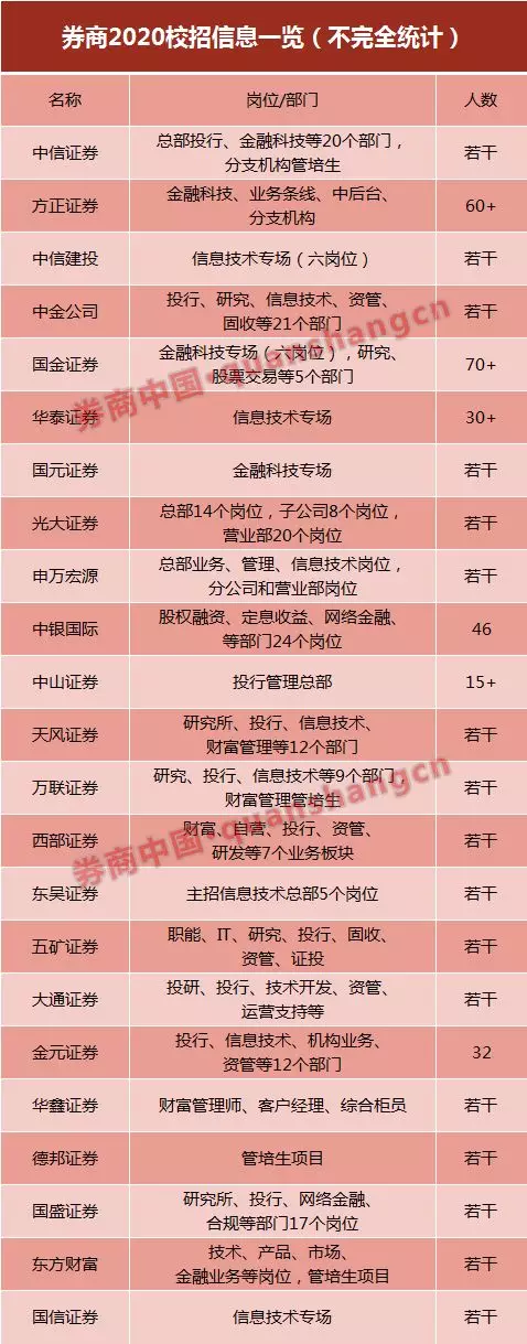 近日,中信证券全面开启了2020年校园招聘计划,加上之前率先开启校园招聘的华泰证券、国信证券、国金证券、德邦证券等机构,已有共计20余家券商加入了优质人才的抢夺战中。