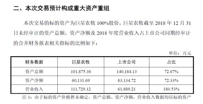 同时,根据巨星农牧2018年未经审计的财务数据初步测算,2018年标的公司营业收入为11.17亿元,占上市公司2018年营业收入6.19亿元的比例为180.53%,超过100%。根据《重组管理办法》第十三条的规定,本次交易预计构成重组上市。