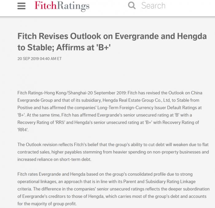 惠誉为何下调恒大评级展望?非地产支出增加,销售持平,短债压力