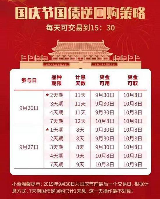 9月26日,操作2天期、3天期和4天期国债逆回购,可计息11天,9月30日资金可用,10月8日资金可取;