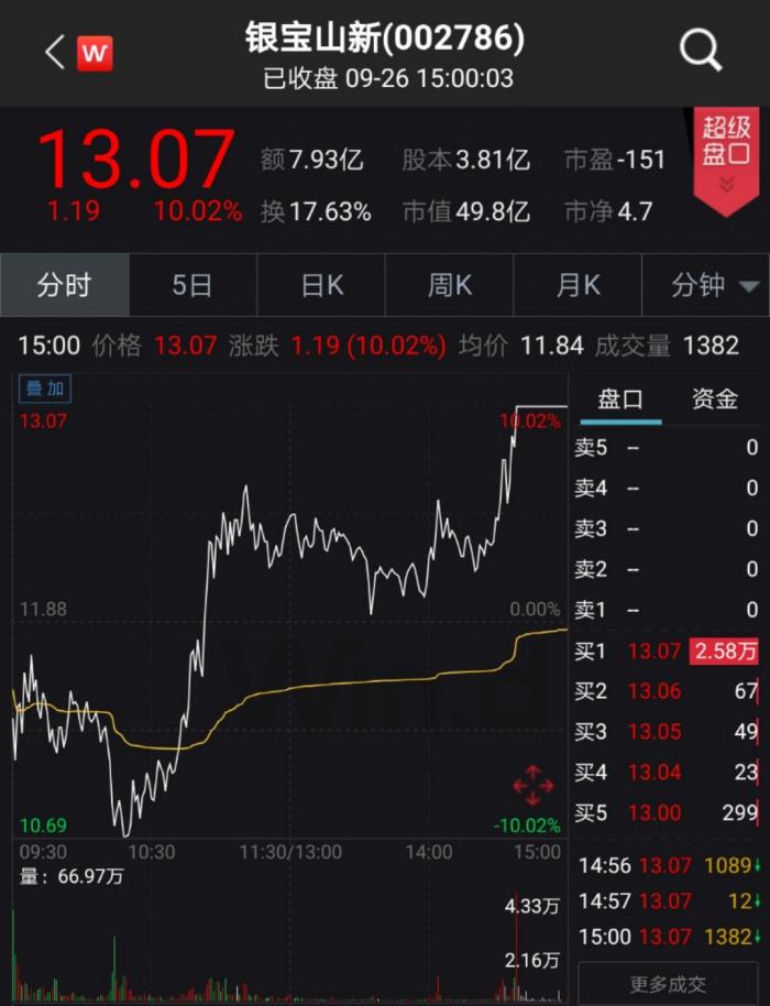 9月26日,银宝山新的股价走势尤为惊险,早盘一度跌停,尾盘快速拉升涨停,现地天板走势,报收13.07元。