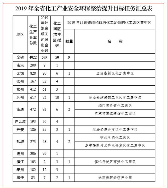 21世纪经济报道记者9月26日获悉,江苏省化工产业安全环保整治提升领导小组近日印发了《关于下达 2019 年全省化工产业安全环保整治提升工作目标任务的通知》(下称“通知”),给出了全省的整治方案。