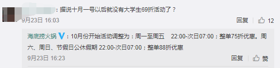 但10月1日后,海底捞将政策修改为周一到周五的22:00到次日的7:00大学生可享受7.5折优惠,而周六周日的22:00到次日的7:00,只能享受到8.8折优惠。相当于取消了下午场的优惠,只有午夜场了,并且优惠力度也有所降低。