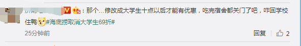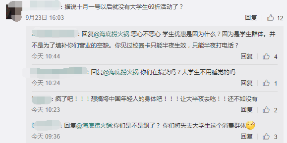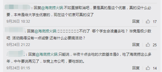 由于大学城一般都不在市中心,而海底捞一般都开在繁华商业区,有6.9折的时候,学生群体才热衷于从较为偏僻的大学城去“市中心”在海底捞聚餐一次。但改为午夜场后,深夜出行没有公共交通,一来一回成本不低,此外女学生们还需要担心安全因素。学生群体属于价格敏感型客群,他们认为,经过这次调整,海底捞可能是在变相赶客。