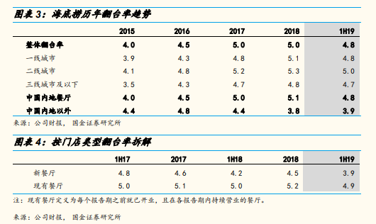 此外,尽管海底捞财报数字亮眼,却暗含翻台率、同店销售增长率持续下滑的问题。数据显示,今年上半年,海底捞的翻台率自2017年起再创新低,从2017年上半年5次/天跌至4.8次/天;同店销售增长率也由2017年上半年6.4%减少至4.7%。其中,三线及以下城市的同店销售增长率为12.5%,超过一线、二线城市的3.3%和1.9%。