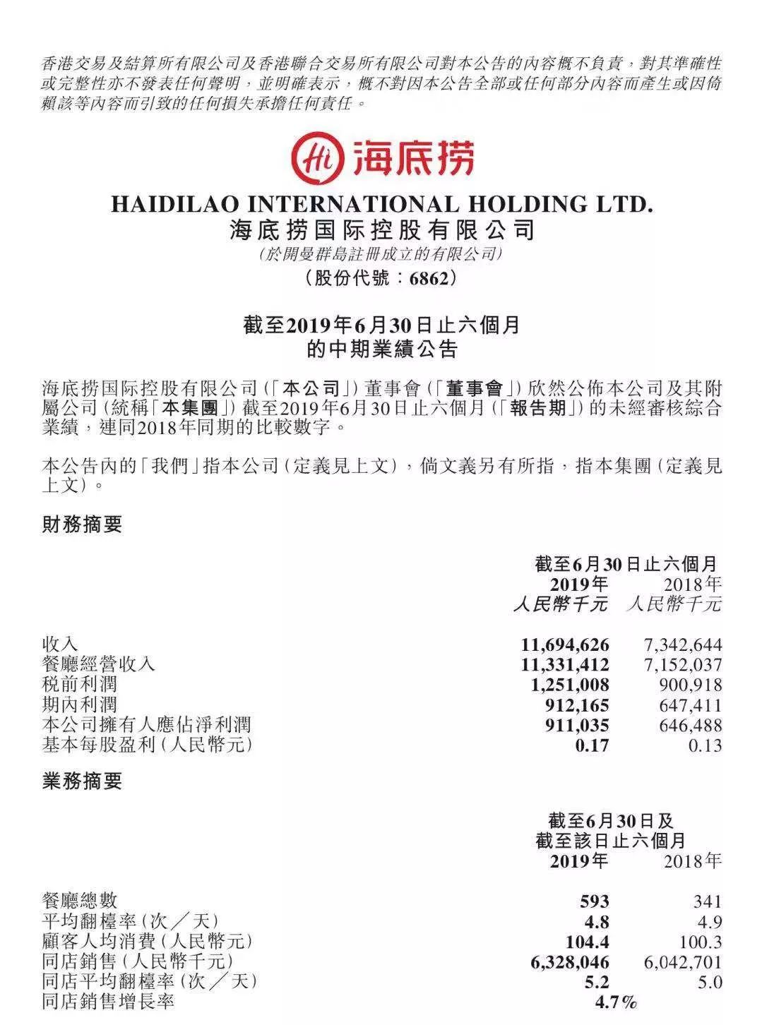 8月20日晚间,海底捞发布半年报,2019年上半年集团收入116.94亿元,同比增长59.3%;营业利润9.12亿元,同比增长40.89%;公司股东应占利润9.11亿元,同比增长40.92%,新开餐厅130家,门店总数增至593家。