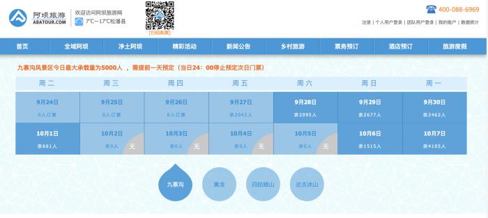 9月27日,九寨沟景区部分景观恢复开放。据阿坝旅游网显示,开放首日已有2958人订票。国庆长假期间,10月2日到5日的门票已售罄,其他时间段仍有余票。景区局部开园门票、车票价格暂定为:旺季(4月1日至11月15日)门票169元/人、车票90元/人,淡季(11月16日至次年3月31日)门票80元/人、车票80元/人。