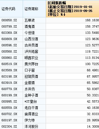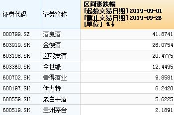 进入9月后,酒鬼酒、金徽酒、迎驾贡酒处于领涨状态,月初至26日涨幅分别达到41.87%、26.08%和20.48%。