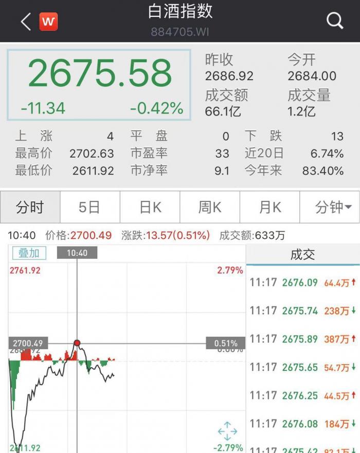 诡异的是,早盘白酒股出现早盘大幅杀跌,白酒指数跌幅一度达到2.79%,随后又重新转为小幅收涨。