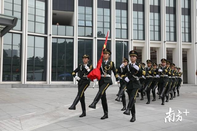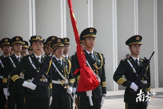 10时30分,来自吉林大学珠海学院国旗护卫队与澳门城市大学国旗仪仗队的20余名队员英姿飒爽,护卫着鲜艳的五星红旗,表情专注而坚定,齐步走向升旗台。