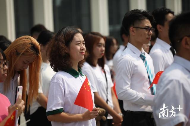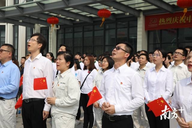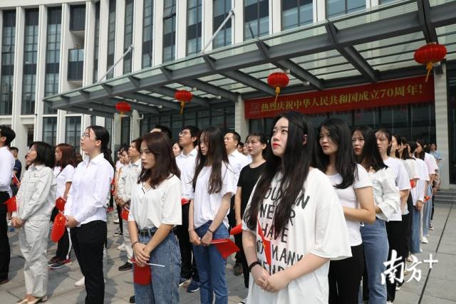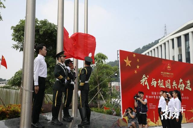 “升国旗、奏国歌!”随着指挥员的口令,雄壮的国歌奏响,旗手奋力将国旗展向天空。鲜艳的五星红旗荡出一道优美的弧线,迎着朝阳冉冉升起。来自粤港澳三地的200余名大学生目光紧紧跟随升起的国旗,高声齐唱国歌。
