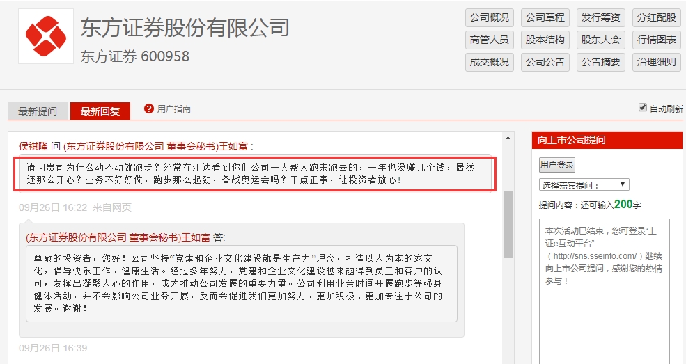 东方证券一共收到了10个投资者问题,其中9个与公司经营以及提升投资者回报有关。如网名“迷茫的韭菜”的投资者问董秘王如富:“公司以15元非公开发行股份,目前股价长期跌破发行价,有对投资人有补偿方案吗?”网名“假笑猫”的投资者问:“目前自营业务主要涉及哪些类型?都多大规模”等。