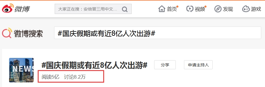 日前携程发布的国庆旅游预测报告显示,“2019国庆假期或有8亿人次出游”。这一话题马上成为焦点,登上微博热搜榜,话题阅读次数达到5亿,讨论量超8万。