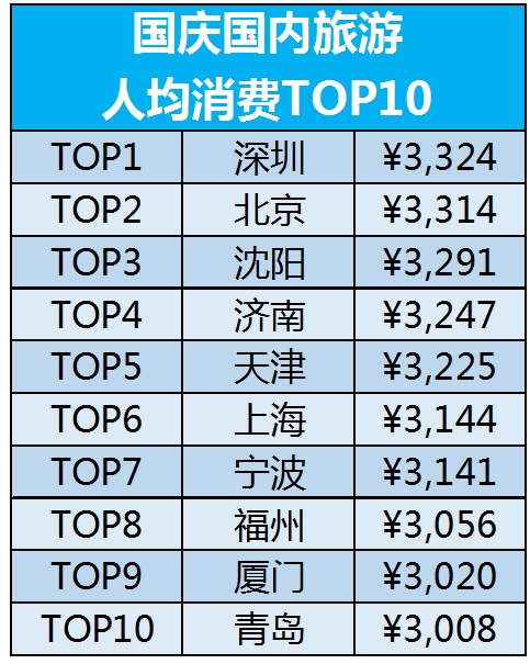深圳、北京、沈阳、济南、天津、上海、宁波、福州、厦门和青岛成为最舍得花钱的城市,单次国内游人均花费超过3000元。