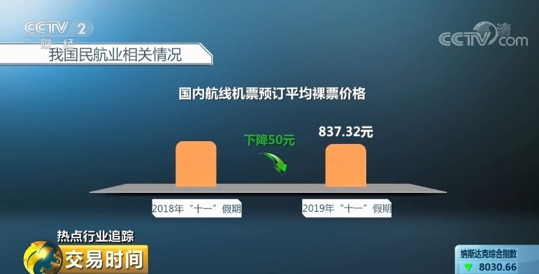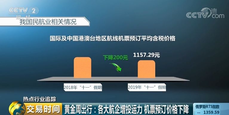 其中,国际及中国港澳台地区航线机票预订的平均含税价格为1157.29元,较2018年同期均价下降近200元,国内航线机票预订的平均裸票价格837.32元,较2018年均价下降近50元。