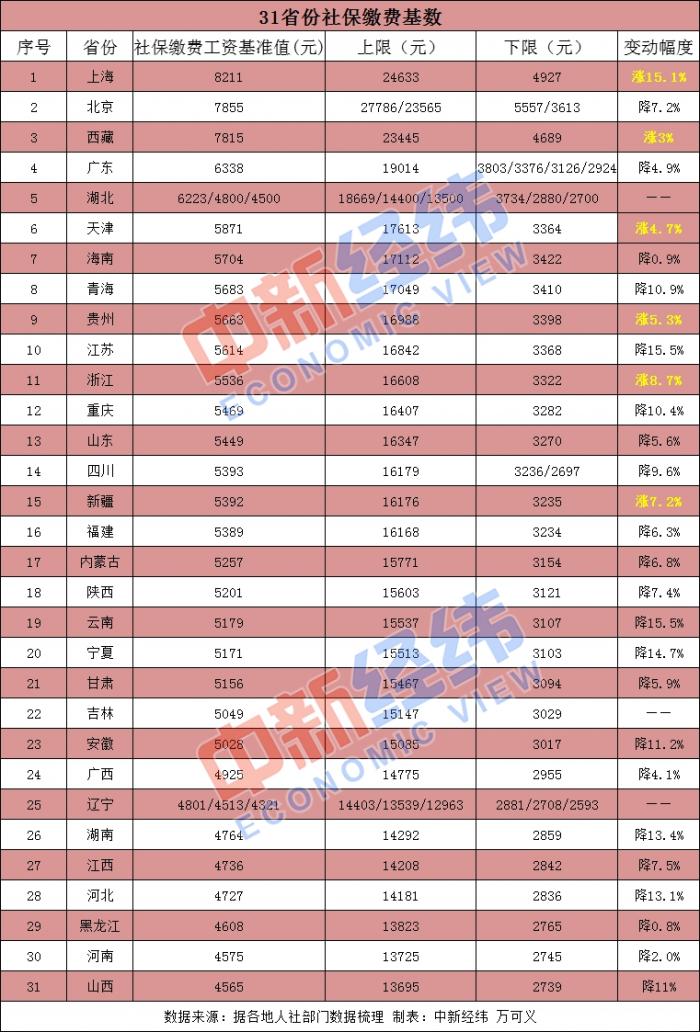 从变化情况来看,大多数地区不同幅度降低了缴费基数。江苏、云南两省社保缴费基数降幅居前两位,均为下降15.5%;此外,青海、重庆、宁夏、湖南等7省份降幅也都超过10%。