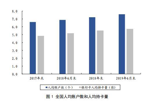 账户和银行卡的普及是民众获得金融服务、消除“金融排斥”的第一步。目前我国人均拥有的银行账户数和持卡量均处于发展中国家领先水平。截至2019年6月末,我国人均拥有7.6个银行账户、持有5.7张银行卡,较2014年末分别提高60%和50%。