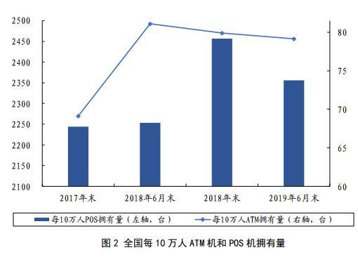 截至2019年6月末,我国每10万人拥有ATM机79台,显著高于亚太地区平均水平的63台;我国每10万人拥有POS机2356台,较2014年末实现翻倍。