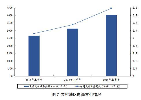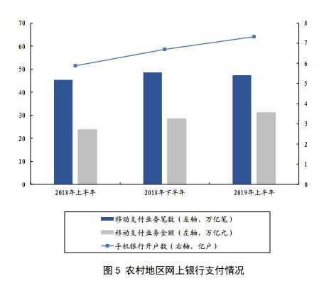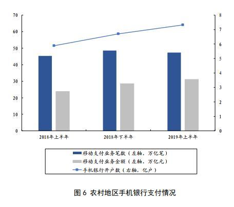 农村地区电子支付进一步推广,为农村电商发展提供支撑。2019年上半年,农村地区发生网银支付业务63.54亿笔、金额74.27万亿元,发生移动支付业务47.35亿笔、金额31.17万亿元;银行机构办理农村电商支付业务3.57亿笔、金额4030.33亿元;银行卡助农取款服务点发生支付业务(含取款、汇款、代理缴费)2.14亿笔、金额1813.25亿元。