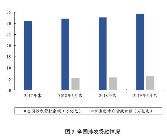 金融支持乡村振兴力度不断加大。截至2019年6月末,全国涉农贷款余额34.24万亿元,其中,农户贷款余额9.86万亿元。普惠型涉农贷款余额6.10万亿元,占全部涉农贷款的17.80%,较年初增长8.24%,高于各项贷款平均增速1.11个百分点。2019年上半年,全国农业保险为1.17亿户次农户提供风险保障约2.57万亿元,为1500.52万户次受灾农户支付赔款203.09亿元。