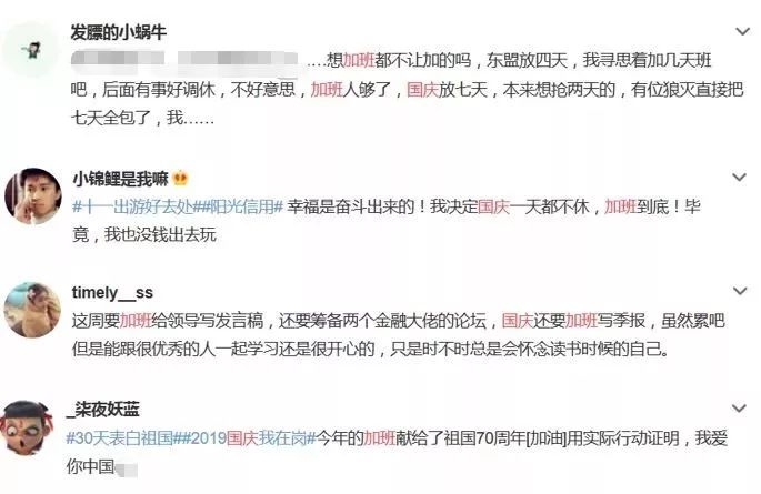 有网友为幸福奋斗,决定国庆一天不休;也有网友认为,“能和优秀的人一起学习”虽然累但很开心;