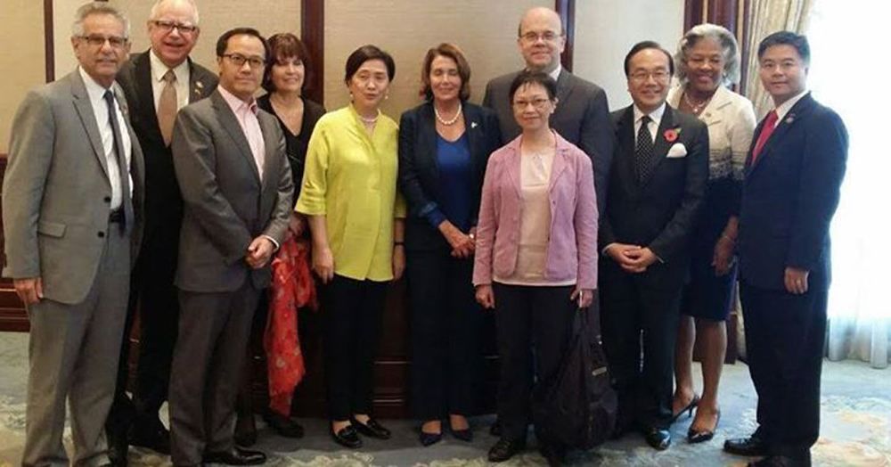 刘慧卿(左五)、梁继昌(左三)、何秀兰(紫色外套)及梁家杰(右三)与美国民主党领袖佩洛西(中)及多名美国国会议员会面